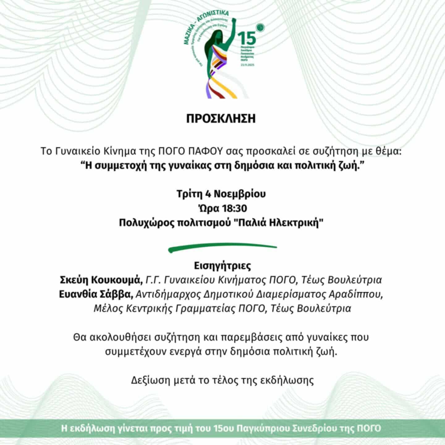 Το Γυναικείο Κίνημα της ΠΟΓΟ Πάφου διοργανώνει εκδήλωση/συζήτηση με θέμα: «Η συμμετοχή της γυναίκας στη δημόσια και πολιτική ζωή», αύριο Τρίτη 4 Νοεμβρίου 2025, ώρα 18:30 στον Πολυχώρο Πολιτισμού “Παλιά Ηλεκτρική”.