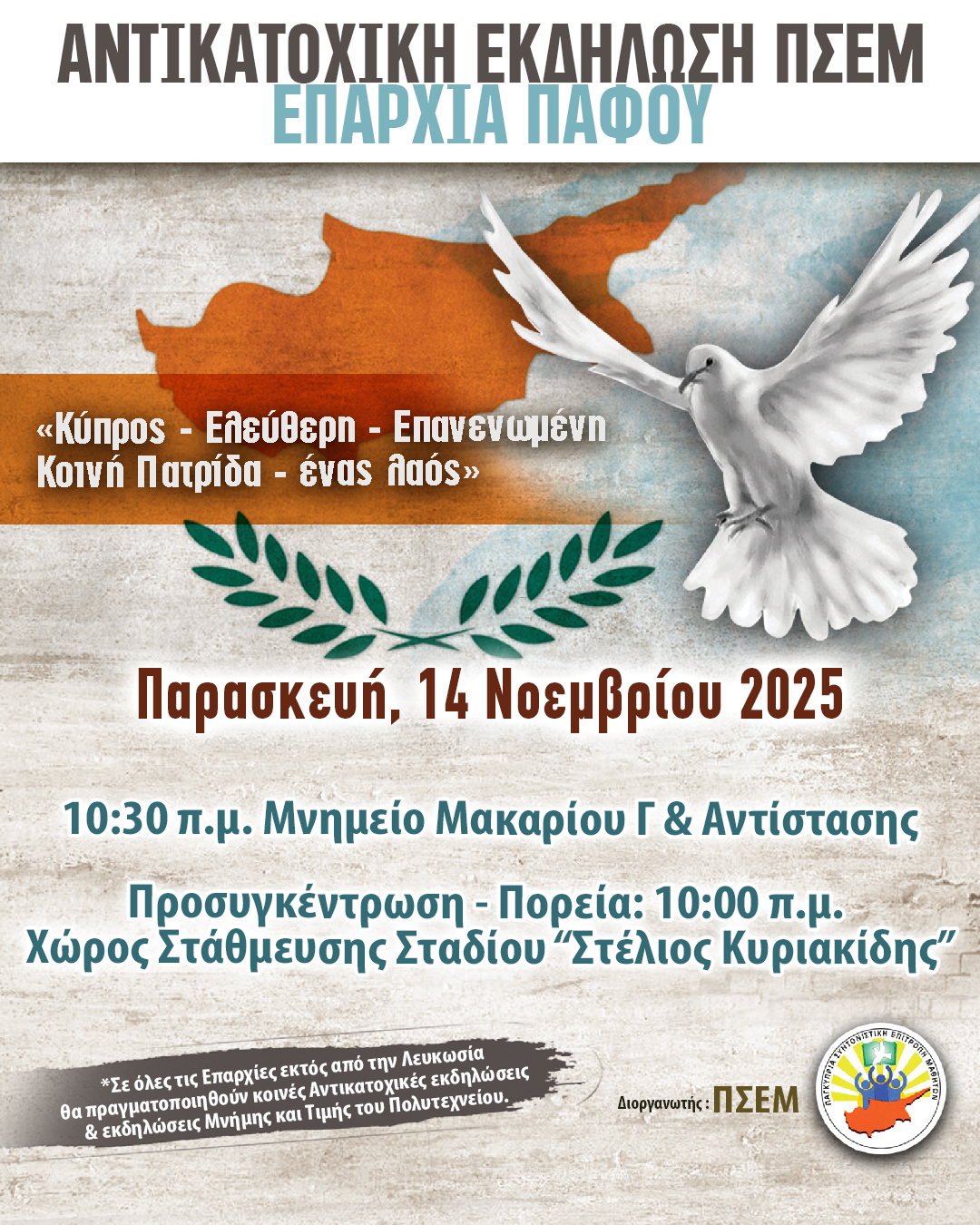Η εκδήλωση της ΕΣΕΜ Πάφου θα πραγματοποιηθεί την Παρασκευή 14 Νοεμβρίου και ώρα 10:30 π.μ. στο μνημείο “Μακαρίου Γ΄ και Αντίστασης” και θα προηγηθεί προσυγκέντρωση και πορεία η ώρα 10:00 π.μ από το χώρο στάθμευσης του σταδίου “Στέλιος Κυριακίδης”.