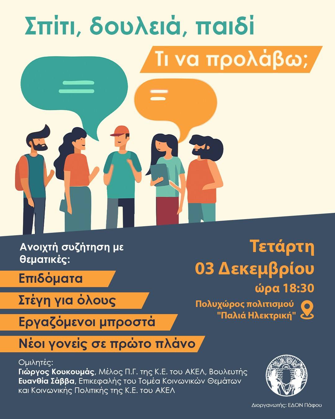 Το τμήμα νέων εργαζομένων της ΕΔΟΝ Πάφου διοργανώνει ανοιχτή συζήτηση με τίτλο “Σπίτι, δουλειά, παιδί – Τι να προλάβω;” με στόχο την ενημέρωση και συζήτηση με τους νέους και νέες για τις δυνατότητες και τις προοπτικές στήριξης της νέας γενιάς.