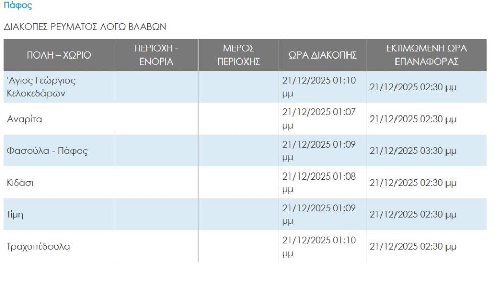 Από την άλλη, η χαλαζόπτωση έχει προκαλέσει και διακοπές ρεύματος σε τουλάχιστον έξι περιοχές της επαρχίας Πάφου, με τα συνεργεία της ΑΗΚ να εργάζονται εντατικά για αποκατάσταση της βλάβης.
