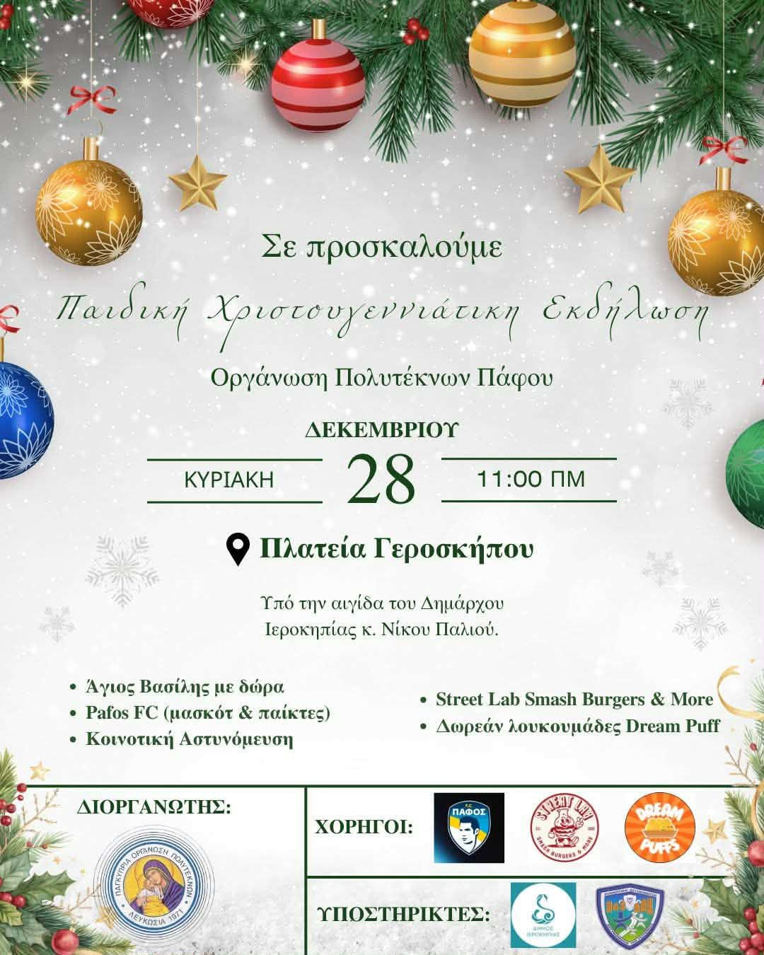 Η Οργάνωση Πολυτέκνων Πάφου διοργανώνει Παιδική χριστουγενιατικη εκδήλωση την Κυριακή 28 Οκτωβρίου 2025 μεταξύ των ωρών 11:00 – 13:00 στην πλατεία Γεροσκήπου.
