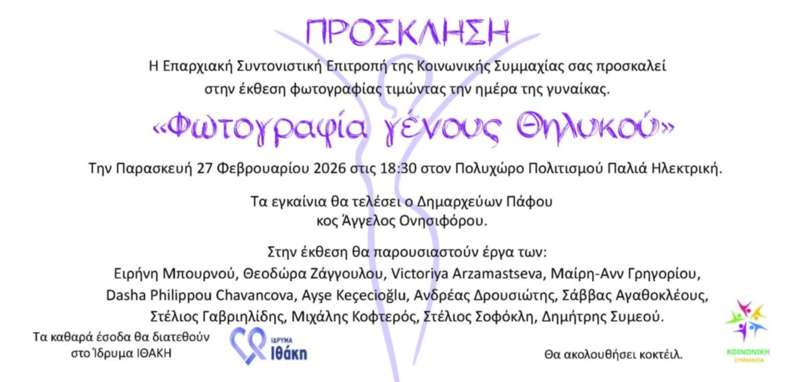 Η Επαρχιακή Συντονιστική Επιτροπή της Κοινωνικής Συμμαχίας διοργανώνει έκθεση φωτογραφίας με τίτλο «Φωτογραφία Γένους Θηλυκού», τιμώντας την Ημέρα της Γυναίκας, την Παρασκευή 27 Φεβρουαρίου 2026 και ώρα 18:30, στον Πολυχώρο Πολιτισμού Παλιά Ηλεκτρική, στην Πάφο.