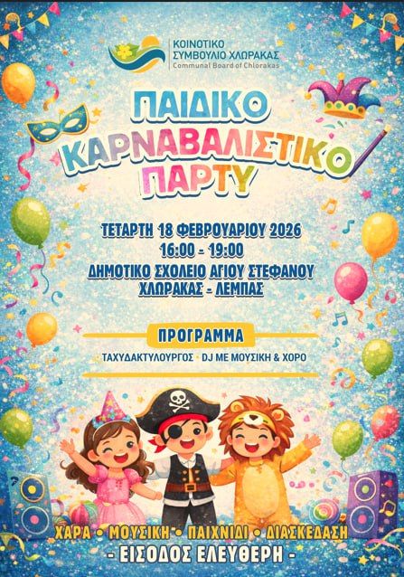 Το Κοινοτικό Συμβούλιο Χλώρακας προσκαλεί μικρούς και μεγάλους σε ένα ξέφρενο Παιδικό Καρναβαλίστικο Πάρτι, που θα πραγματοποιηθεί την Τετάρτη 18 Φεβρουαρίου 2026, από τις 16:00 μέχρι τις 19:00, στο Δημοτικό Σχολείο Αγίου Στεφάνου Χλώρακας – Έμπας, στη Χλώρακα.
