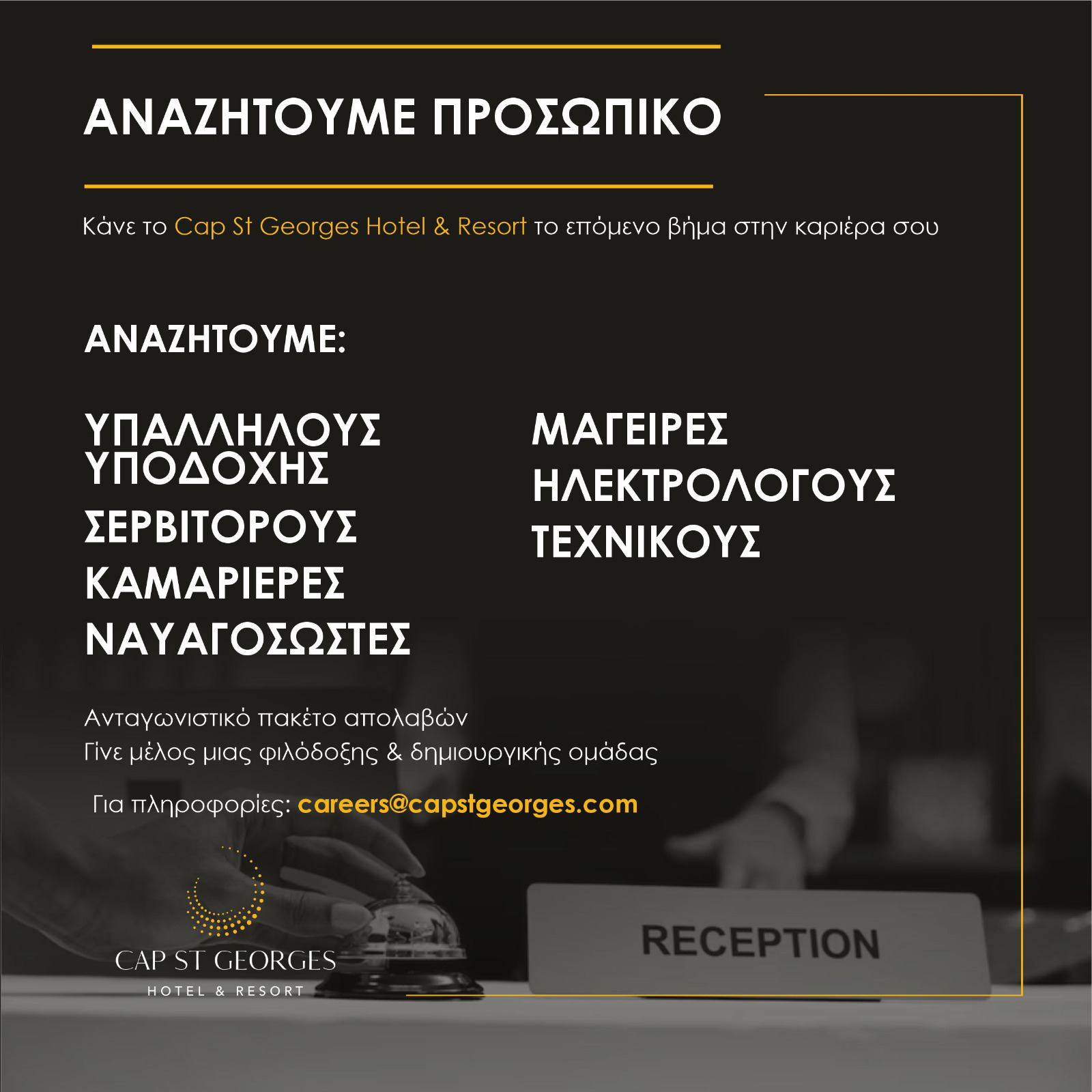 Υπαλλήλους Υποδοχής, Σερβιτόρους, Καμαριέρες, Ναυαγοσώστες, Μάγειρες, Ηλεκτρολόγους, Τεχνικούς