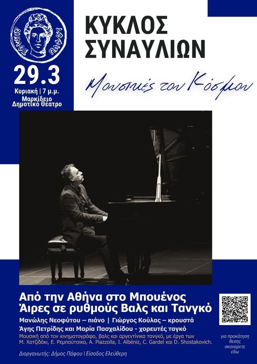 Ο Δήμος Πάφου σας προσκαλεί στη συναυλία «Από την Αθήνα στο Μπουένος Άιρες σε ρυθμούς Βαλς και Τανγκό», στο πλαίσιο του κύκλου «Μουσικές του Κόσμου».