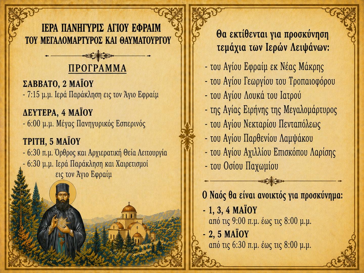Την Δευτέρα, 4 Μαΐου, στις 6:00 μ.μ. θα τελεστεί Μέγας Πανηγυρικός Εσπερινός, χοροστατούντος του Θεοφιλεστάτου Επισκόπου Χύτρων κ. Λεοντίου. Θα ακολουθήσει περιφορά της Ιεράς Λάρνακας του Αγίου Εφραίμ.