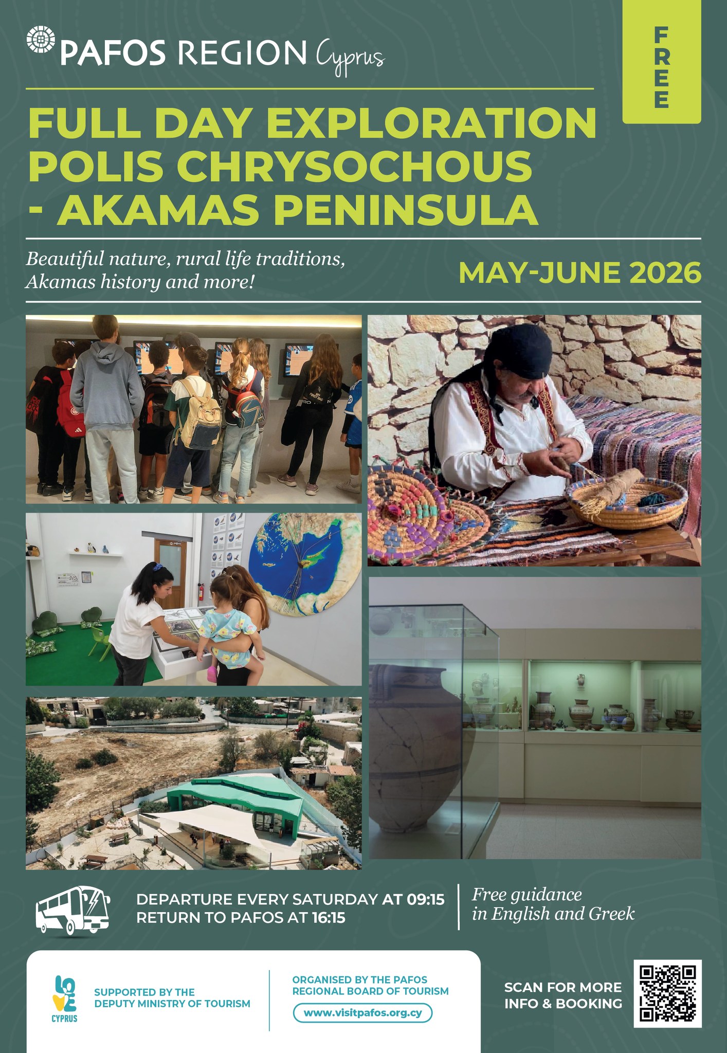 Η εκδρομή που στηρίζεται από τους Δήμους Πόλης Χρυσοχούς και Ακάμα θα πραγματοποιείται αρχικά για τους Μήνες Μάιο και Ιούνιο κάθε Σάββατο, εντελώς δωρεάν με αναχώρηση από το αρχαιολογικό Πάρκο Κάτω Πάφου στις 09:15 και επιστροφή στις 16:30 στον ίδιο χώρο.