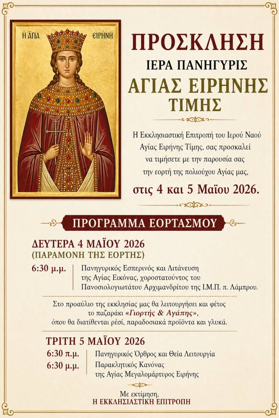 Με θρησκευτική ευλάβεια και λαμπρότητα θα πραγματοποιηθεί και φέτος η Ιερά Πανήγυρις της Αγίας Ειρήνης Τίμης, στις 4 και 5 Μαΐου 2026, με την Εκκλησιαστική Επιτροπή του Ιερού Ναού να απευθύνει ανοιχτή πρόσκληση προς όλους τους πιστούς να τιμήσουν με την παρουσία τους τη μεγάλη αυτή εορτή.