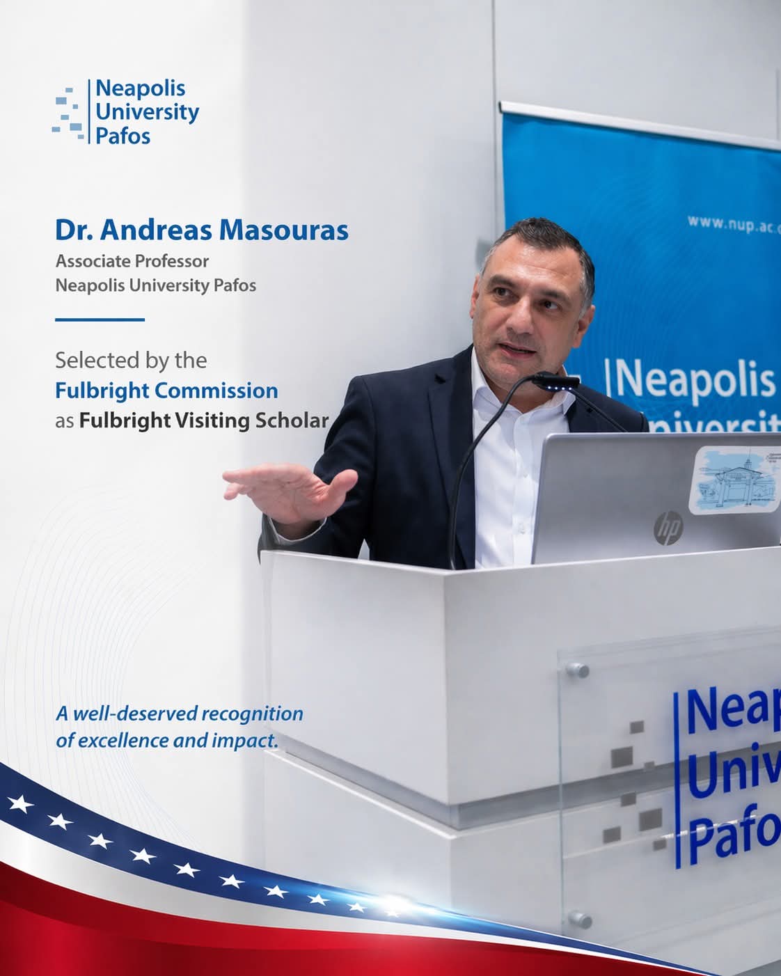 Το Πανεπιστήμιο Νεάπολις Πάφος ανακοινώνει με ιδιαίτερη χαρά και υπερηφάνεια ότι ο Δρ. Ανδρέας Μασούρας, Αναπληρωτής Καθηγητής και Πρόεδρος του Τμήματος Communication & Creativity, έχει επιλεγεί ως υπότροφος του διεθνούς κύρους προγράμματος Fulbright.